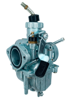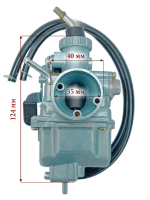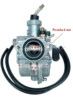 Карбюратор Mikuni VM22 Евро 2 (новая версия). Это все тот же надежный Mikuni VM22, но с небольшими конструктивными доработками. Отличается наличием дополнительного вакуумного клапана, облегчающему запуск холодного двигателя. Особенно актуально для эксплуатации в холодный период времени. Mikuni VM22 (аналог PZ26) зарекомендовал себя как надежный и неприхотливый карбюратор, является одним из лучших решений для установки на кабовские моторы с рабочим объемом 110-125 см³ С карбюратором МИКУНИ VM22 Вы получите стабильный запуск мотора практически при любых температурах и хорошие показатели мощности на всем диапазоне оборотов. В этом карбюраторе уже подобраны соответствующие для 110-125 см³ жиклеры, а также выставлены оптимальные настройки, так что дополнительная регулировка (скорее всего) не потребуется. Данный карбюратор рекомендовано ставить на моторы объемом 110-125см³, хотя с завода он и устанавливался на KAYO 140, YCF 150, YX140 motoland 156fmj и т.д.. Подходит на мотоциклы, питбайки и квадроциклы 110-125 кубов: Kayo, Bse, Apollo, Motoland, BRZ, PROGASSI, RACER, SSSR, WELS, REGULMOTO, ATAKI, JMC, AVANTIS, Alfa, Stels, Honda, IRBIS TTR125, VIRAGO 110, Yamaha YBR 125 и подобную мототехнику с двигателем 110-125 см³ Параметры: Диффузор (узкая часть внутри карбюратора) - 22 мм. Диаметр отверстия на впускной коллектор - 26 мм. Отверстия резьбовые для крепления к впускному коллектору под 6 мм болты. Расстояние между центрами крайних отверстий - 48мм. (стандартное). Диаметр воздушного фильтра - 38/39/40 мм. Рекомендованный объем двигателя - 2-х клапанные моторы YX, LF, ZS от 110см³ до 125см³ - YX110 , YX125 и др.. Двухпозиционный подсос, принцип работы: Флажок смотрит вверх - подсос открыт, позиция для запуска и прогрева двигателя; Нижнее положение флажка - подсос закрыт, рабочее положение прогретого двигателя. Отправная точка для настройки винта качества — 1 - 1,5 оборот(а) от закрученного положения/ *На мотоцикл Ямаха ЮБР 125 данный карбюратор ставился с завода начиная с 2009+ гг. выпуска.