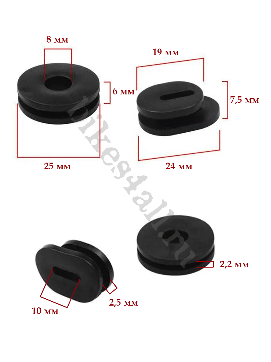 Комплект из 6 резинок для крепления пластика мотоцикла и мопеда 125 кубов. Резиновые втулки используются для крепления бокового пластика (боковой крышки), переднего пластика, обтекателя. Внешний диаметр круглого элемента - 25 мм Внутренний диаметр круглого элемента - 8 мм Другие размеры крепежа пластика сморите на фото. В комплекте: 4 круглые втулки 2 овальные втулки Подходят на мотоциклы: RACER, IRBIS GS125; Yamaha YBR 125; Suzuki Intruder Volusia VL 400; а также Honda, Kawasaki и др.